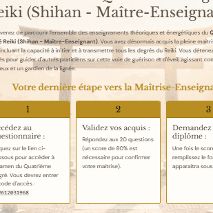 Inscrivez-vous dans la tradition Reiki Usui Shiki Ryoho. Le manuel inclut un Examen Final pour valider votre compréhension théorique et pratique du grade de Shihan.